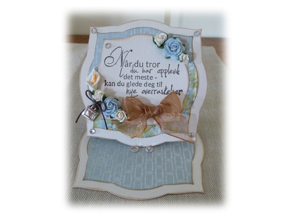 Jeg har brukt papirer fra Pion Design, stanser fra Martha Stewart, blomster og pynt fra Wild Orchid Crafts